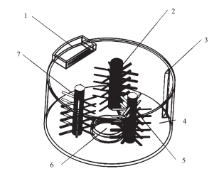 1.進(jìn)料口 2.主槳 3.壁部刮刀 4.料倉 5.第二副槳 6.出料口 7.副槳